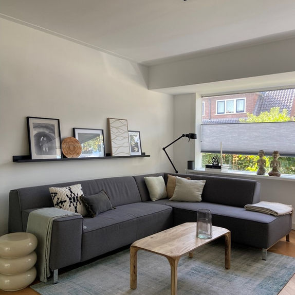 De basis bestaat uit Scandinavische kleuren - wit, zand en grijsgroen - gecombineerd met natuurlijke materialen zoals hout, linnen en rotan. Het resultaat is een frisse, eigentijdse gezinswoning met een subtiel strandsfeertje, waarin warmte en eenvoud samenkomen.